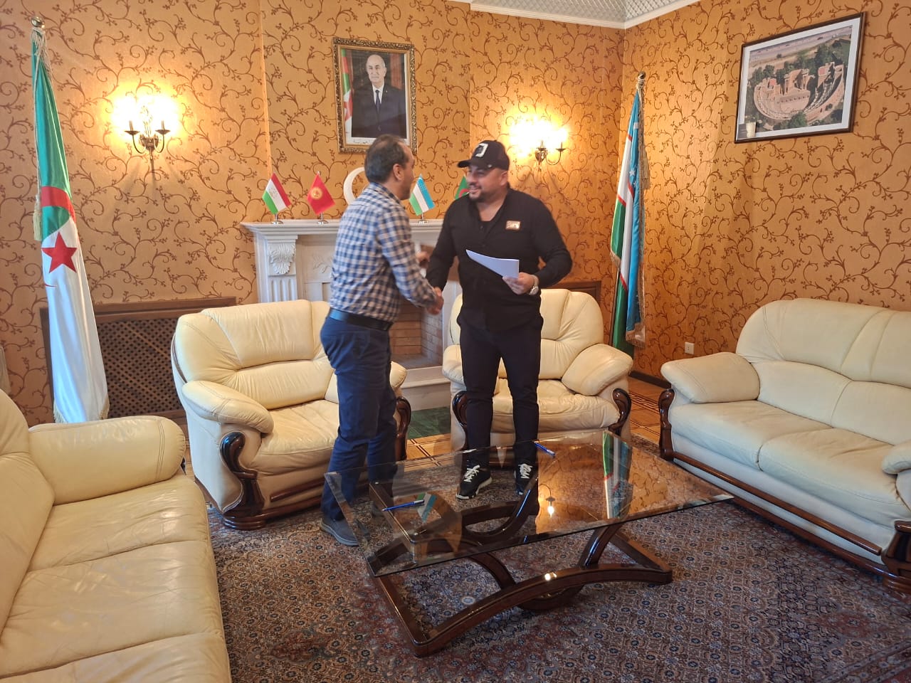 لقاء السيد الناصر بوشريط، سفير، مع السيد أليشير أبيدجانوف، نائب عميد جامعة اللغات العالمية لأوزبكستان