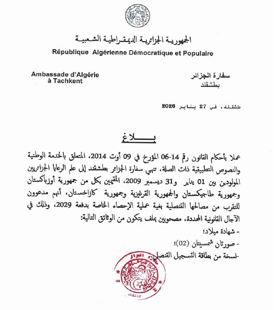 L’Ambassade d’Algérie en Ouzbékistan a l’honneur d’informer les membres de la communauté Algérienne